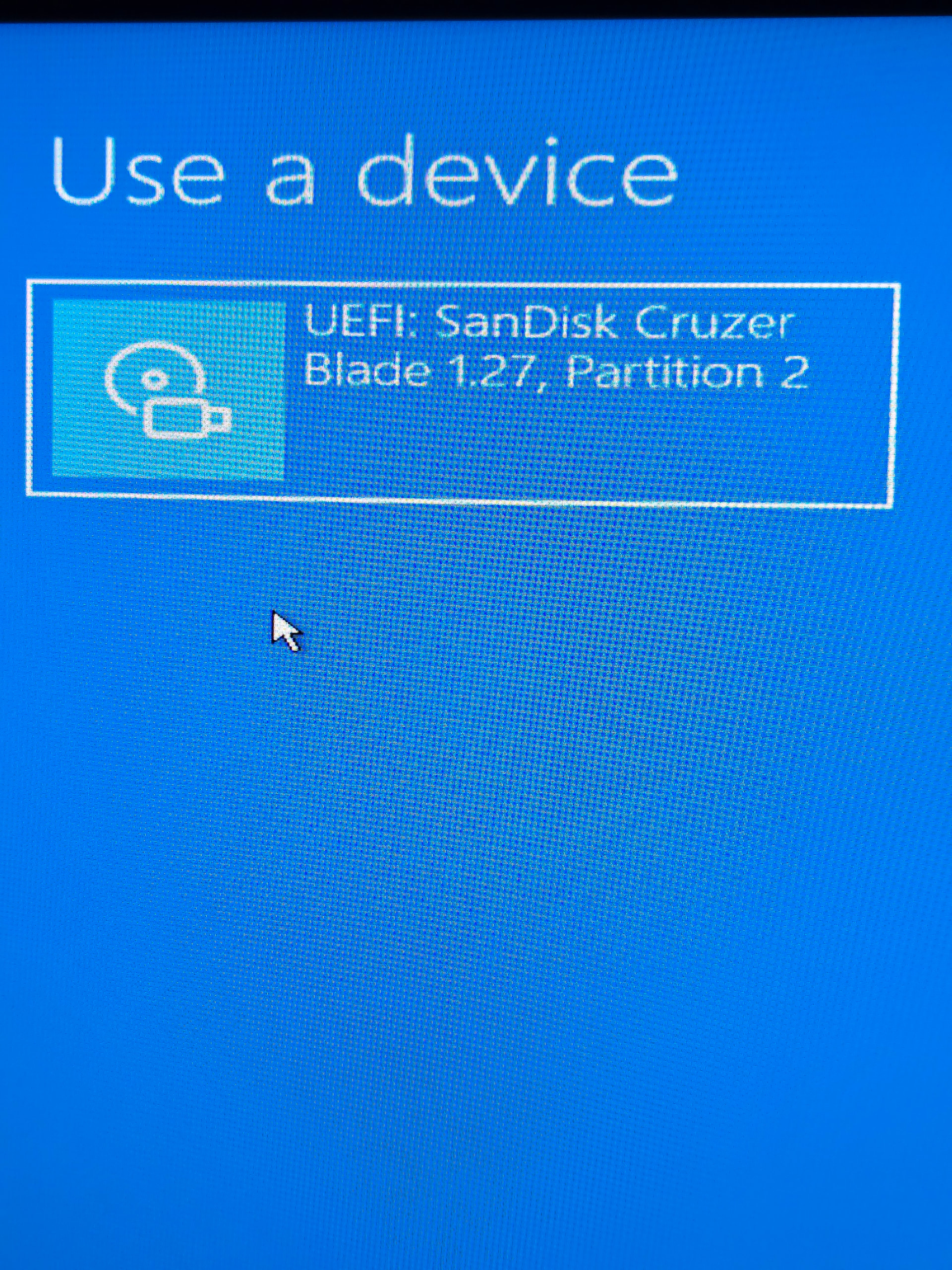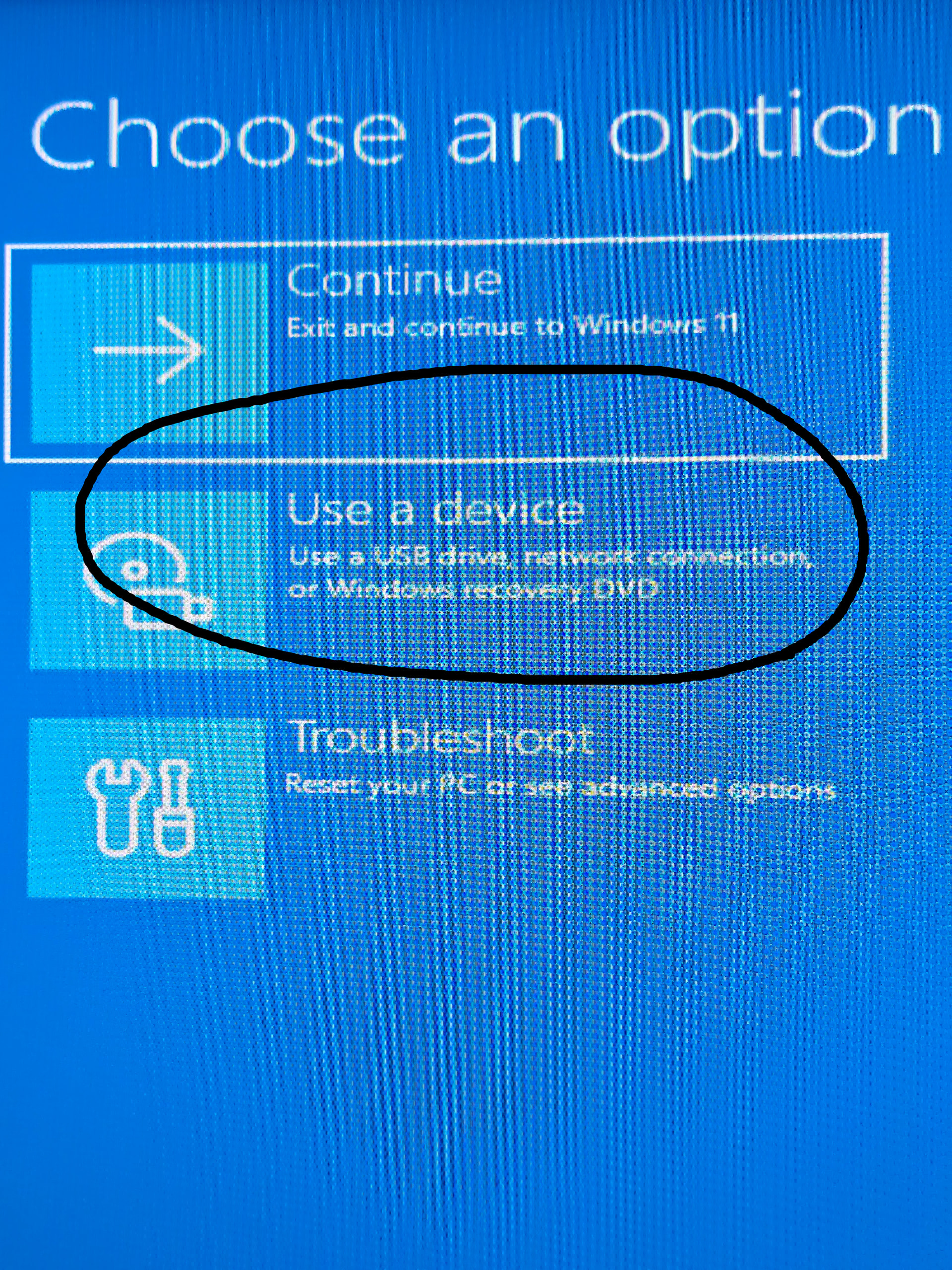 نقوم بفتح قائمة ابدأ واعادة التشغيل مع الضغط على زر Shift كي ندخل على الشاشة الزرقاء حقت وندوز, ثم نختار “Use a device”