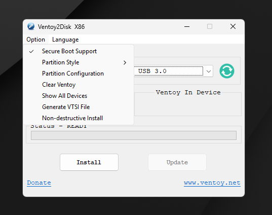 3 - الطريقة المفضله لي استخدام اداة “Ventoy”. ميزة هذا البرنامج أنه يقوم بجعل الفلاشه قابله للاقلاع وبذلك لانحتاج لحرق ملف النظام عليها ويمكنك استخدامها كجهاز تخزين ايضاً, والأكثر إثارة انه يمكنك تثبيت اكثر من نظام تشغيل على نفس الفلاش ميموري!