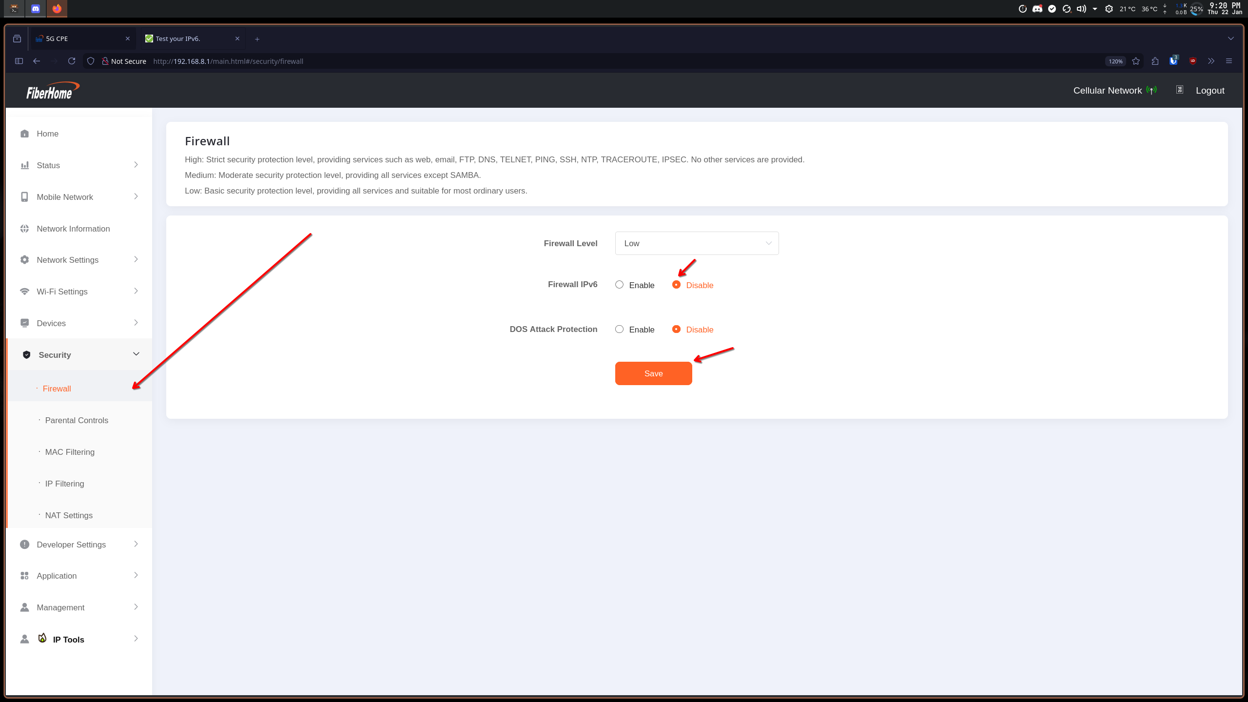 نظرًا لضرورة تعطيل الFirewall، مع IPv6 تصبح الكمبيوترات, الكاميرات، الاجهزة الذكية..الخ قابله للوصول بشكل مباشر عبر الانترنت. عكس الIPv4 حيث تحتاج لعمل IP Forwarding اضافةً الى وجود NAT يحميك. الIPv6 يجعل لكل جهاز عنوان عام قابل للوصول المباشر عبر الانترنت. يرجى التاكد من اعدادات الFirewall الخاصة بالاجهزة والسماح فقط بالمنافذ المراد فتحها.