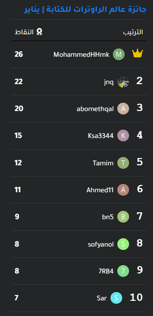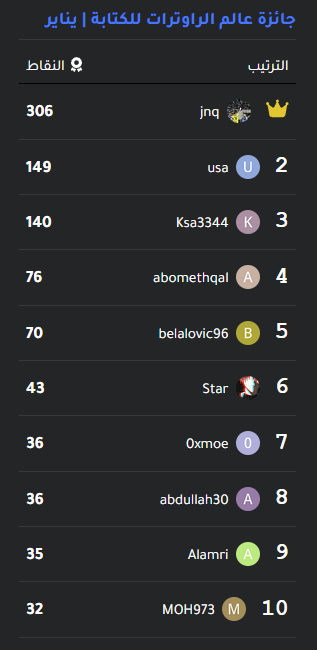 ملاحظة: يظهر ترتيب الأعضاء وعدد نقاطهم في لوحة جائزة عالم الراوترات للكتابة الموجودة في الصفحة الرئيسية للمنتدى (الجهة اليسرى).