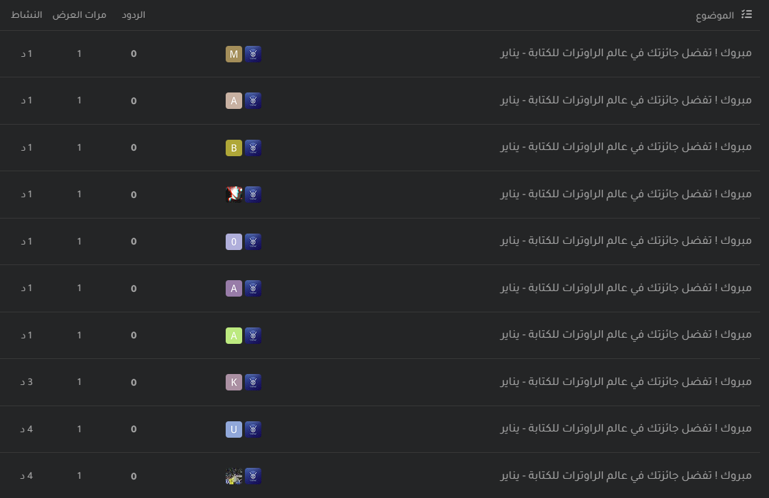 تُبرز المواضيع الفائزة في المنتدى، مع التعريف بصاحب الموضوع و منحه وسام في ملفه الشخصي على مستوى عالم الراوترات.