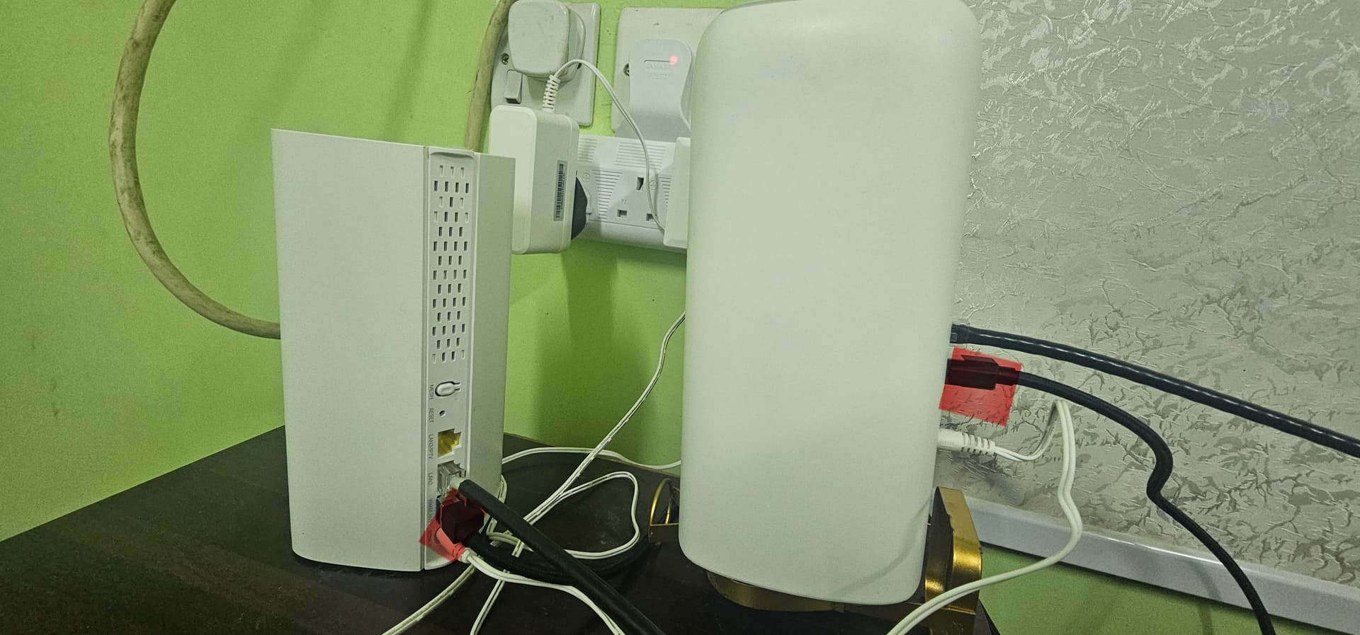 ٣ قطع ولكن اثناء اختبار السرعه يتم توصيل واحد فقط الذي هو مربوط بالرواتر الاساسي بالكيبل لفحص السرعه وطبعا السرعه هي نفسها سواء مربوط واحد او ثالثه وطبعا بدلت بين ٣ قطع وجعل كل واحده هي الاساسيه بعد عمل ضبط المصنع لها ونفس المشكله