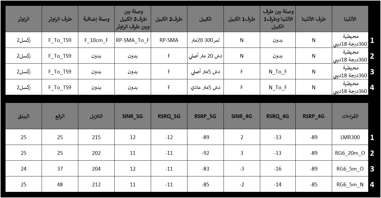وهذي كانت تجربتي قبل كم يوم وحرصت تكون على نفس الظروف قدر الإمكان (نفس الوقت ونفس البرج ورقم الخلية وطبعا نفس الراوتر والأنتينا…الخ) وخليتهم في جدول 4 قراءات ل 4كيابل