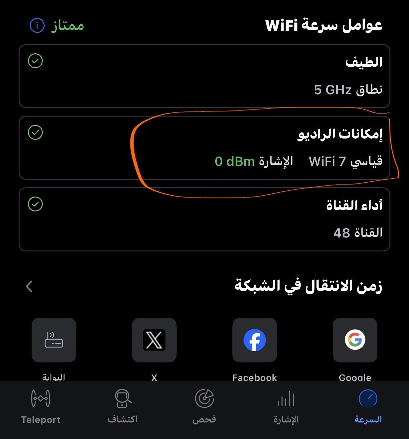 راح يظهر لك بوضوح نوع الشبكة المتصل بها، ومثل ما هو باين لكم في الصورة، إمكانات الراديو Wi-Fi 7
