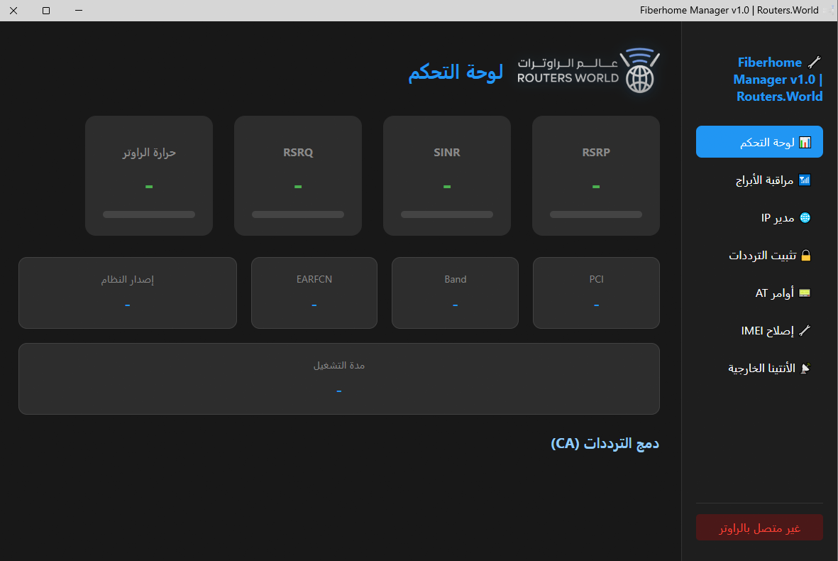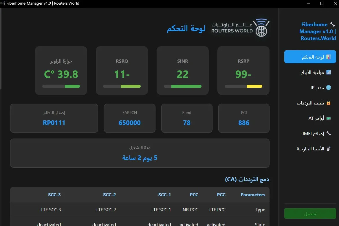 لوحة التحكم — عرض لحظي لحرارة الراوتر، RSRQ، SINR، RSRP